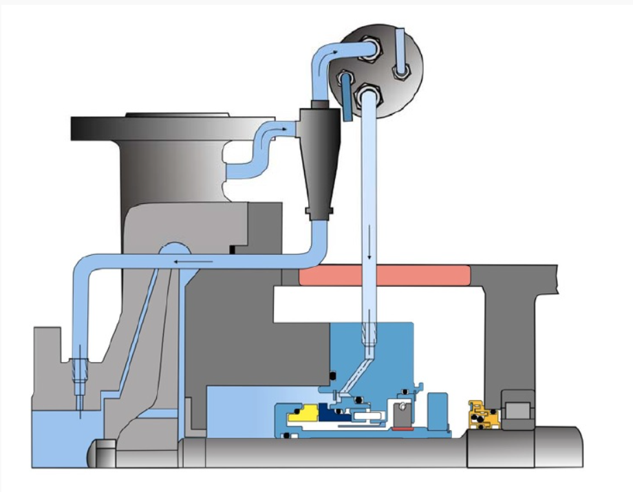 - Теплообменник обеспечивает необходимое понижение температуры для улучшения условий работы вторичных уплотнений;